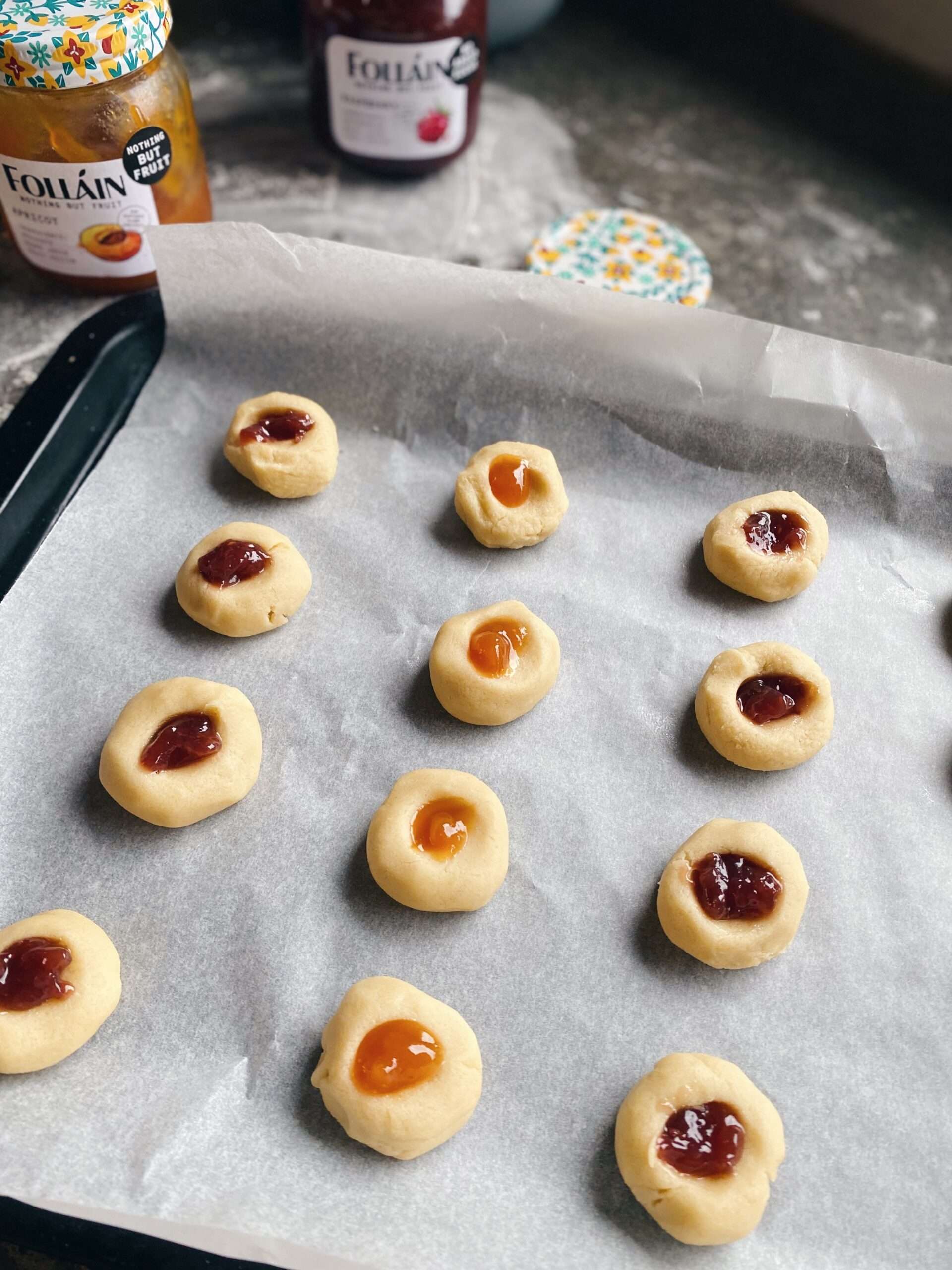 - Déan 16 liathróid beag as an taos, cuir ar trádaire iad agus déan poll beag i lár gach cheann led órdóg!