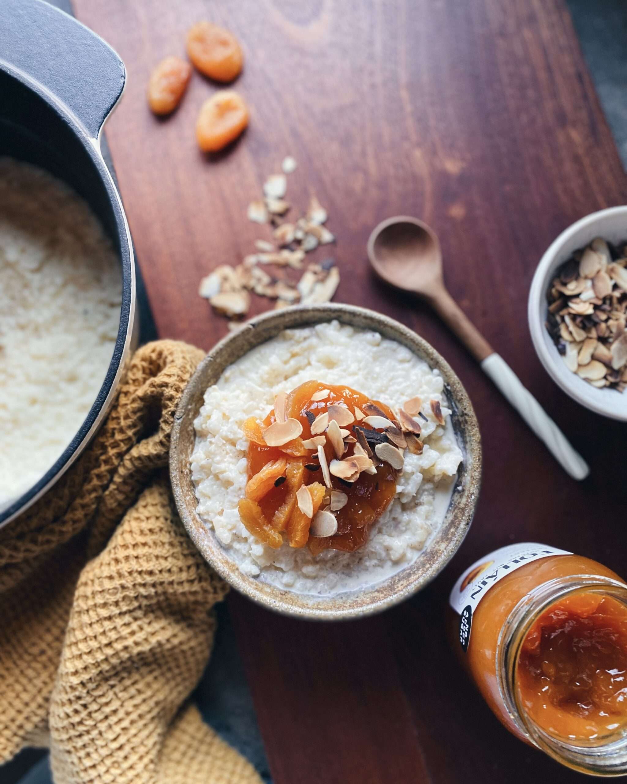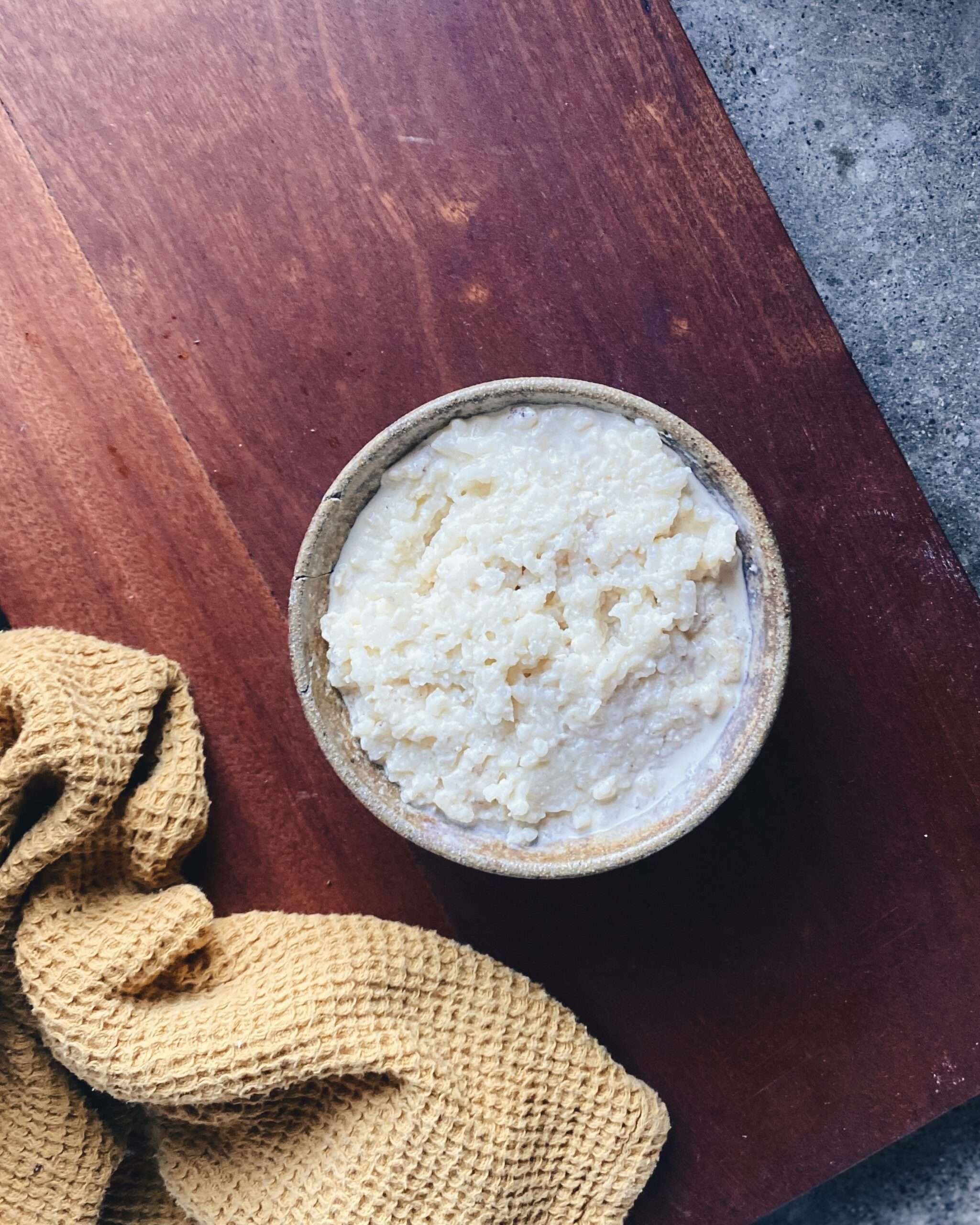 - Cuir an rís agus bainne i sáspan, measc & lig dó beiriú
