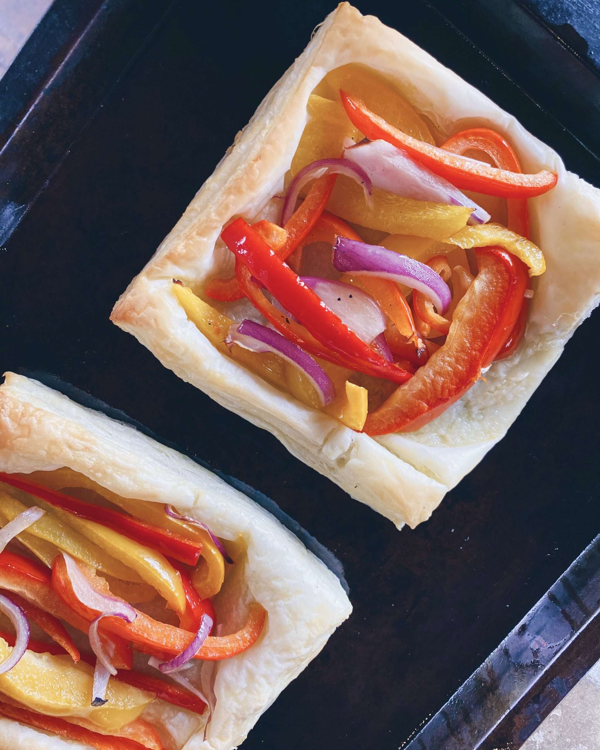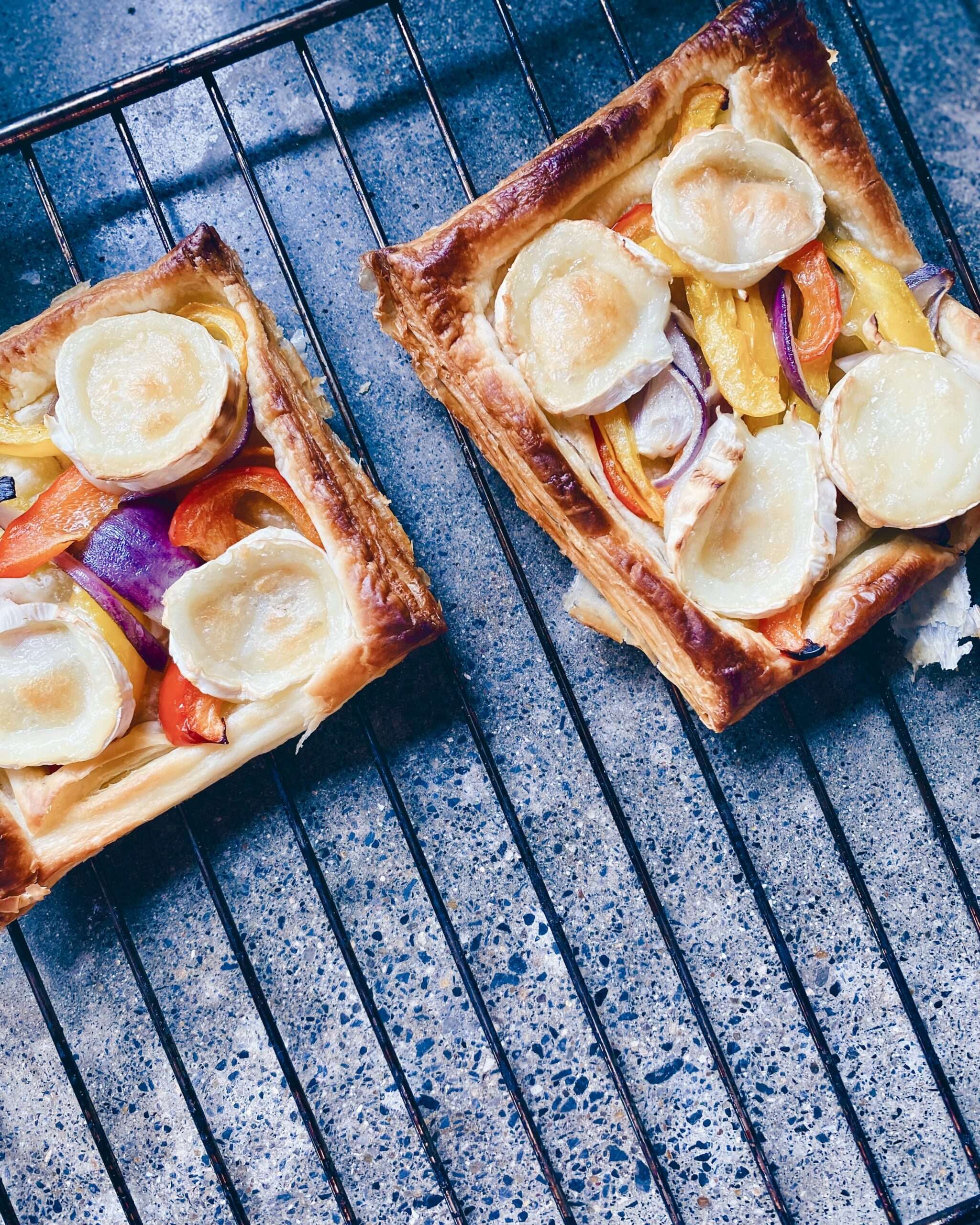 - Cuir i lár an taosrán iad agus bácail ar feadh 10 neomat ar teas árd agus cuir an cáis gabhar ar na glasraí sa lár