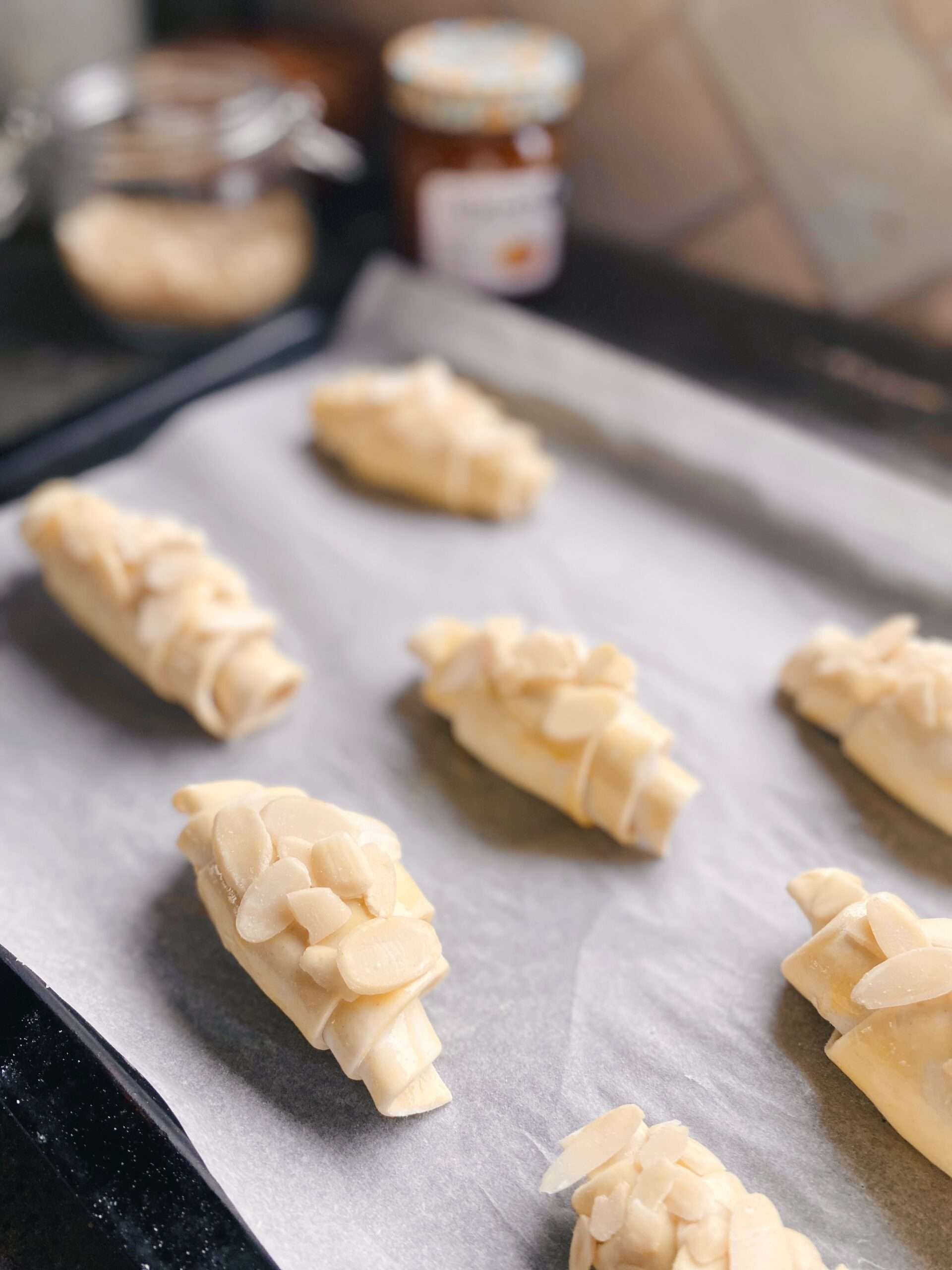 - Spread almond cream on each, roll into croissants.