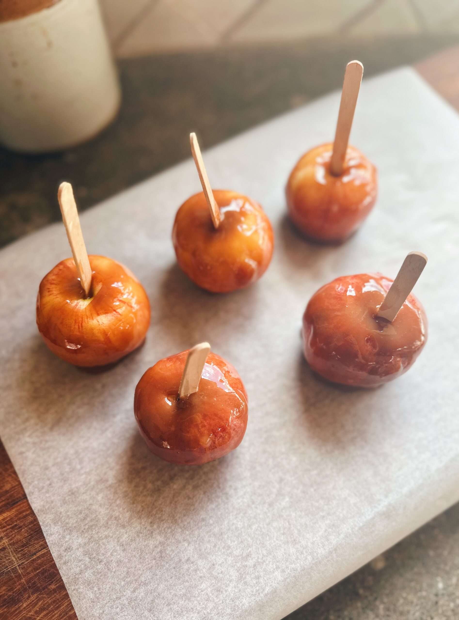 1. Line a tray with parchment paper and insert a stick into each apple.