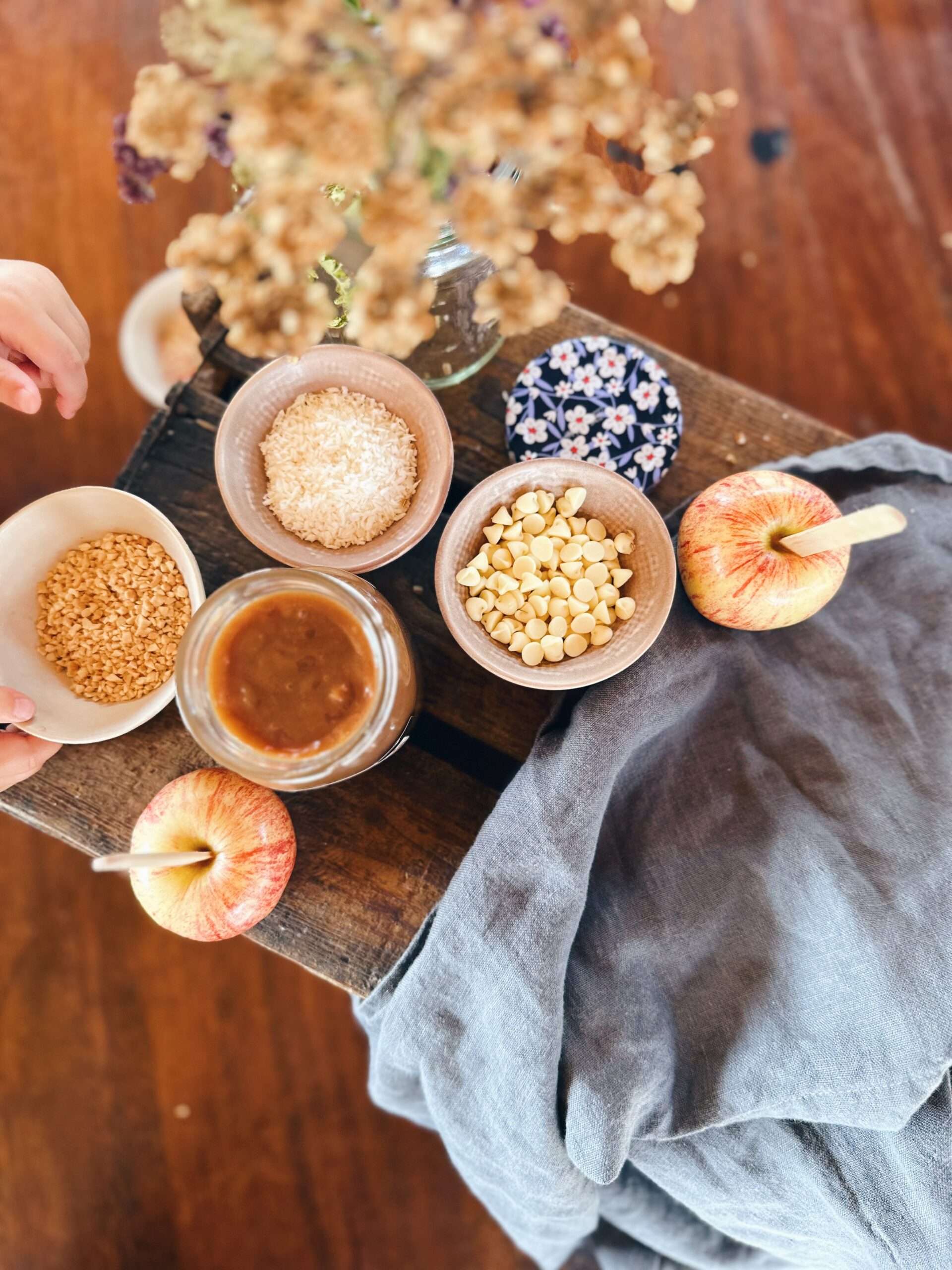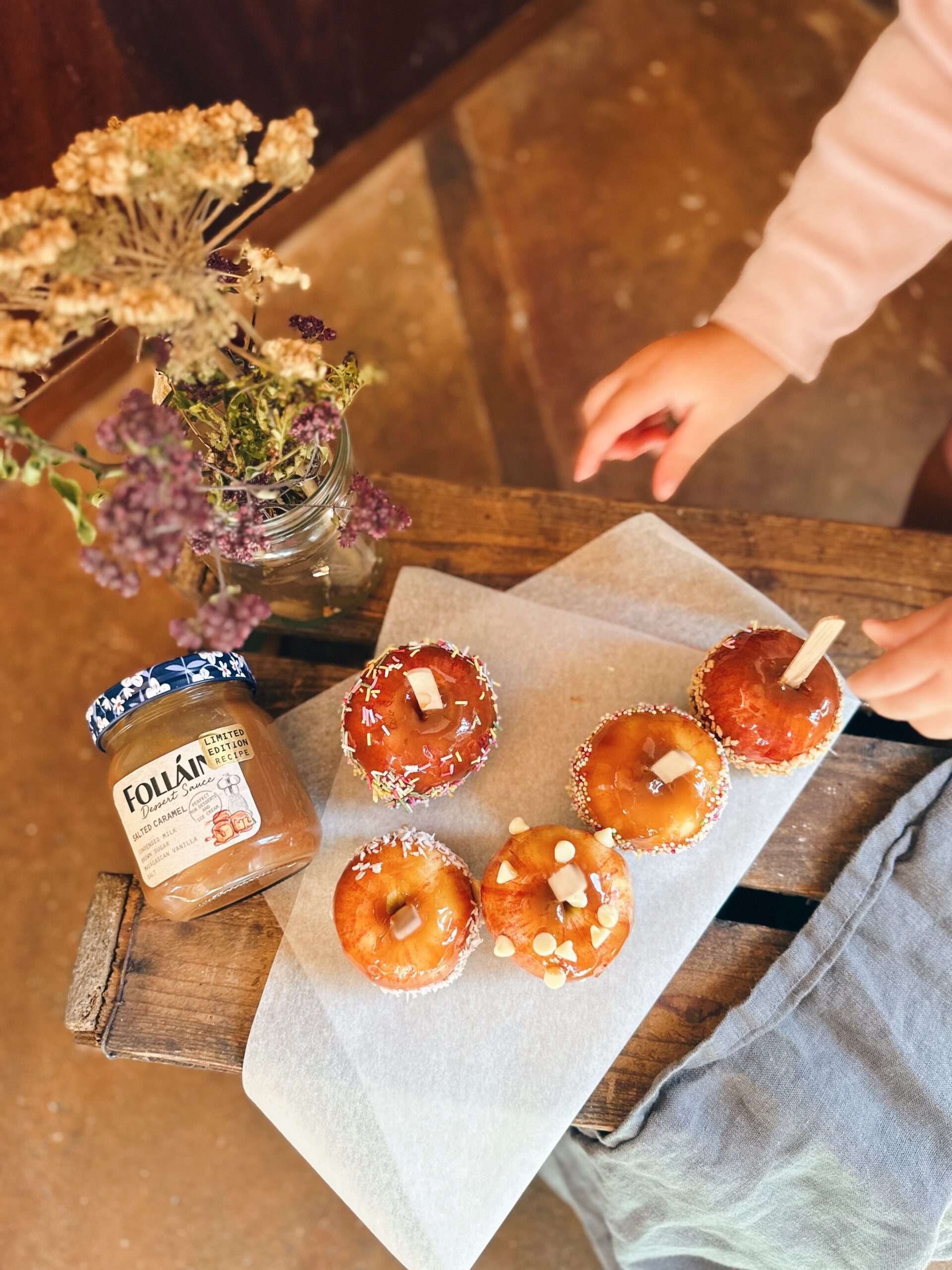 4. While still warm, roll the apples in your chosen toppings — or set up bowls and let guests pick and mix their own.