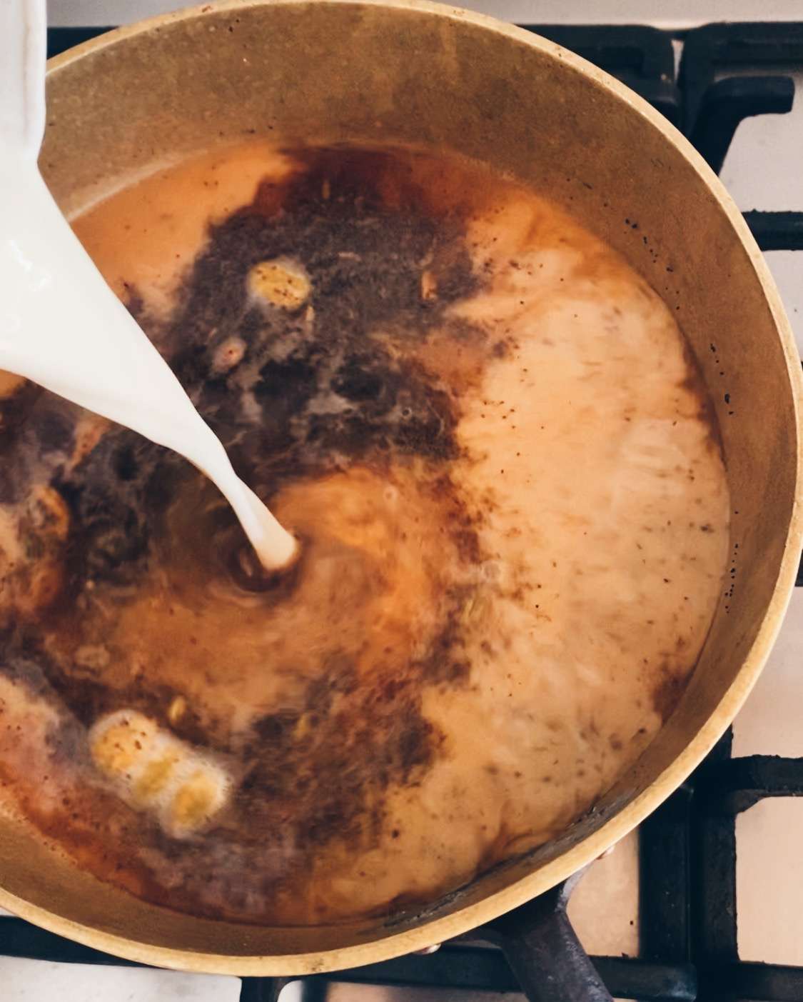 - Simmer water and spices, add tea and cook until deep in colour.