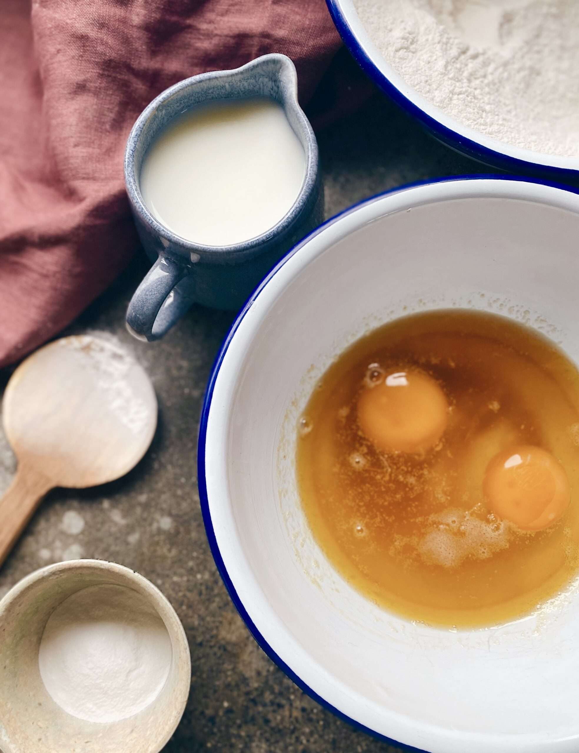 - Start by sifting the self-raising flour, bicarbonate of soda, salt, and caster sugar into a large mixing bowl. In another bowl, whisk together the buttermilk, milk, eggs, and melted butter until well combined. Gently pour the wet ingredients into the dry, stirring until just combined to keep the pancakes light and fluffy.