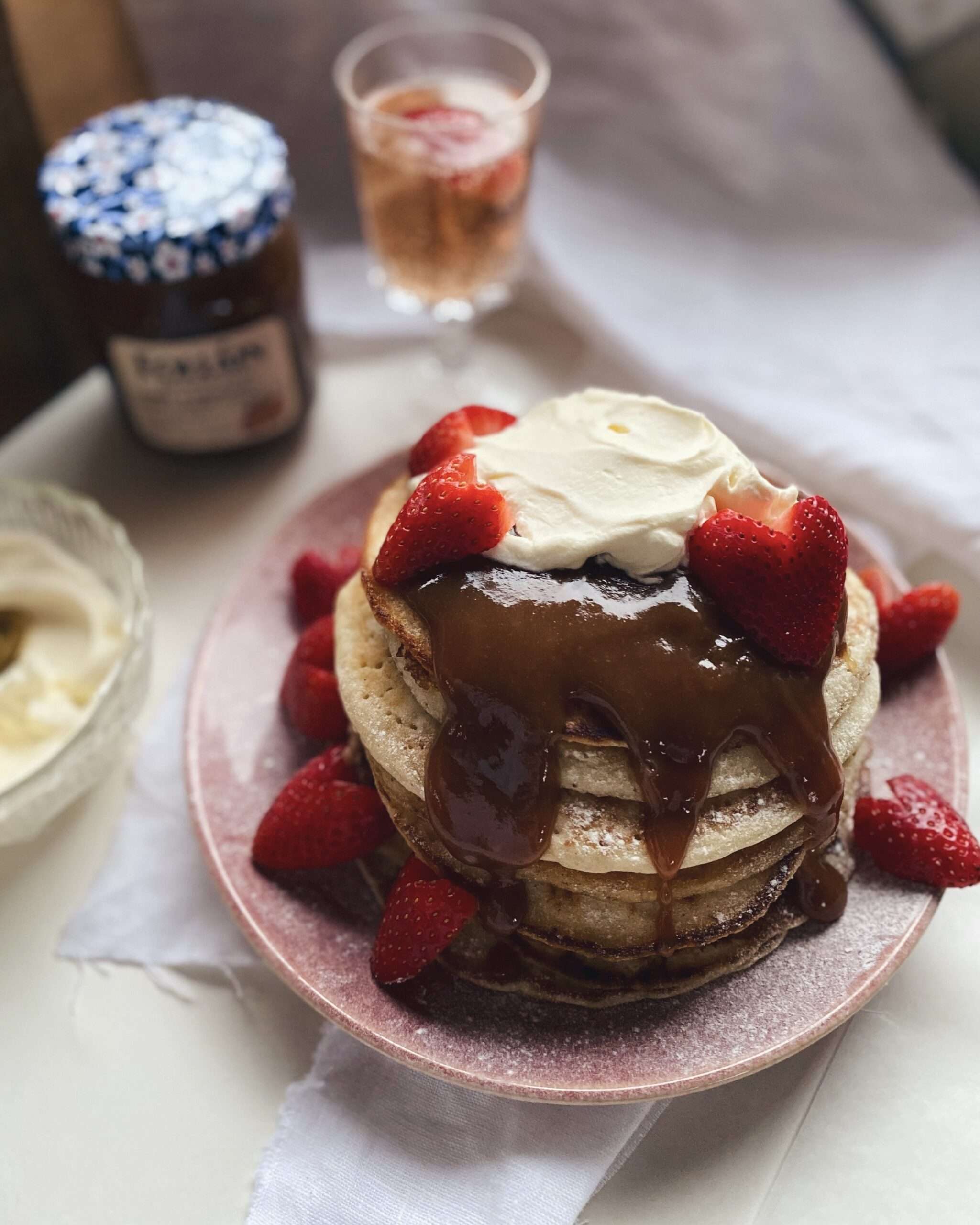 - Stack the warm pancakes high on a plate. Between each layer, add a dollop of fresh cream. Drizzle generously with our Salted Caramel Sauce and top with fresh strawberries.